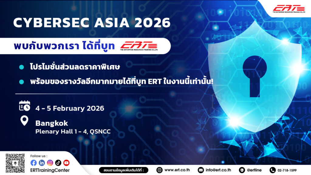 ERT ขอเชิญทุกท่านเข้าร่วมงาน Cybersec Asia x Thailand International Cyber Week 2026 ที่จะจัดขึ้นในวันที่ 4-5 กุมภาพันธ์ 2569 ณ Plenary Hall ศูนย์การประชุมแห่งชาติสิริกิติ์ ภายในงานคุณจะอัปเดตเทรนด์ใหม่ โครงการจากภาครัฐ และทิศทางด้านความปลอดภัยไซเบอร์ที่กำลังมาแรง พร้อมรับฟังมุมมองจากผู้เชี่ยวชาญระดับแนวหน้า รวมถึงยังได้พบปะกับพวกเรา ERT เพื่อรับโปรโมชั่นส่วนลดคอร์สเรียนราคาพิเศษอีกด้วย